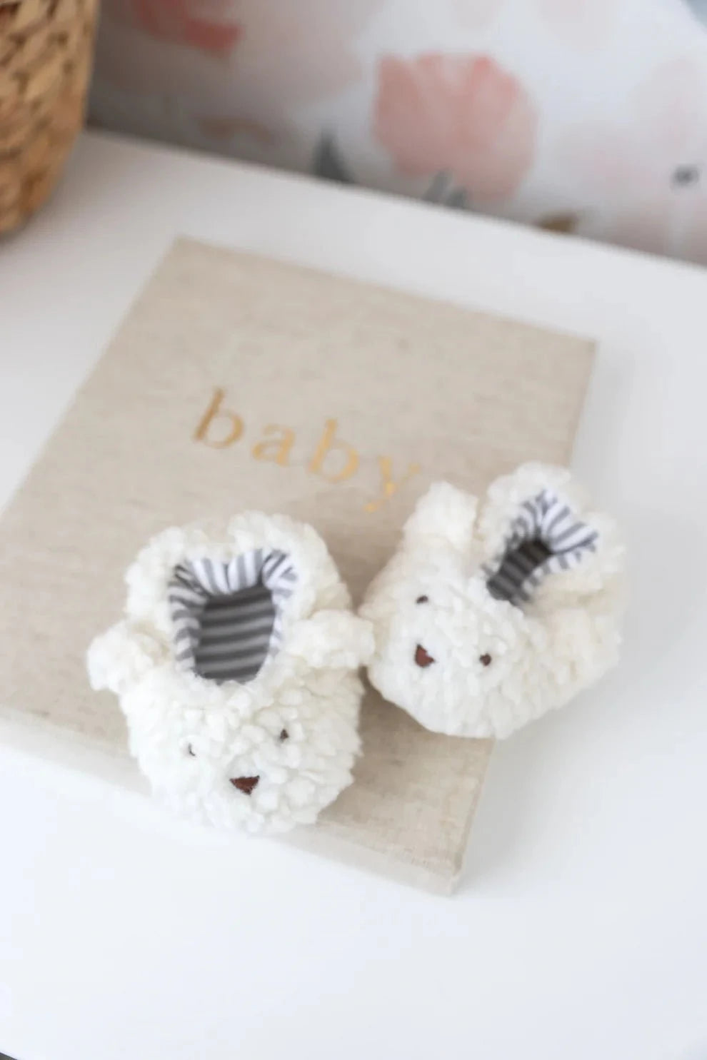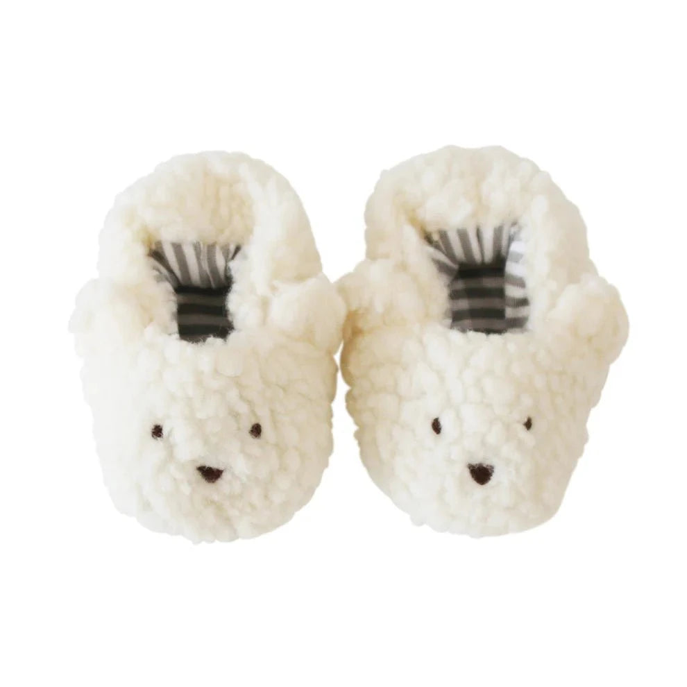 A cute pair of sherpa bear booties. Super soft & cute! For 0 - 6 months. Measuring 12cm long with an encased elastic opening.