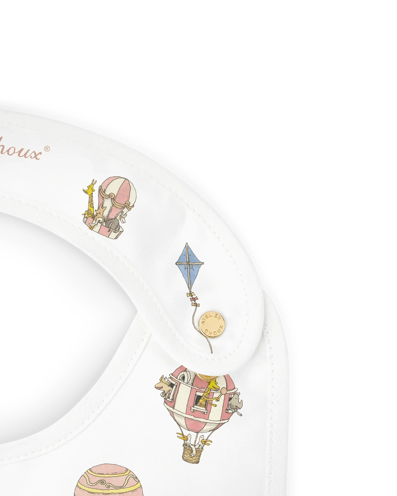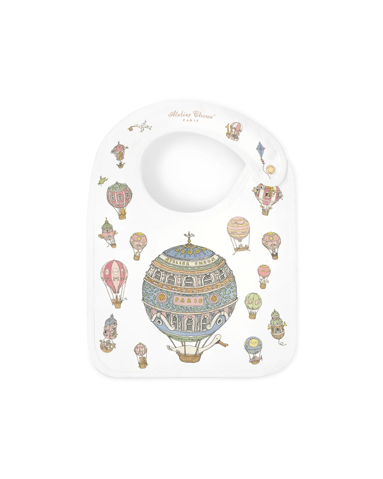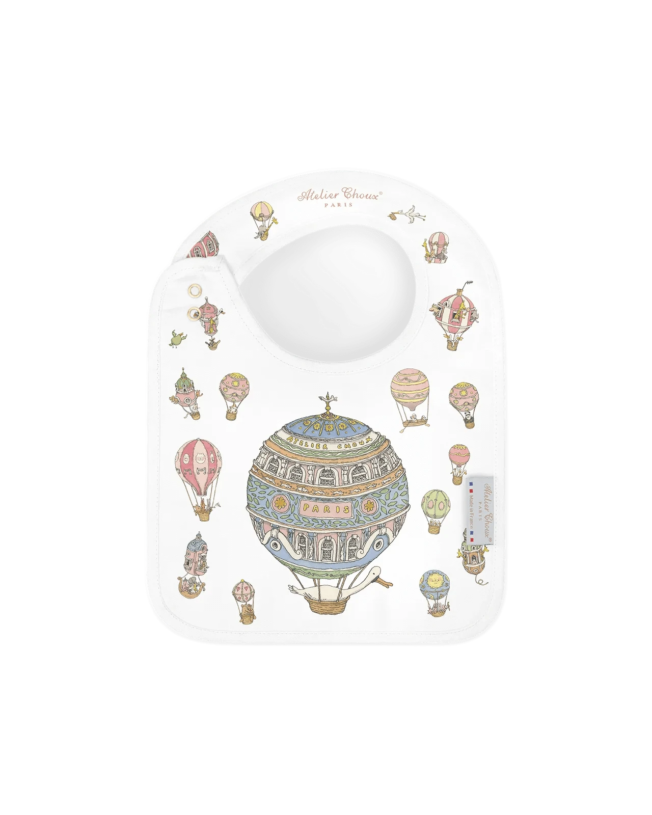 Reversible and adorned with original illustrations on both sides, the Atelier Choux bib blends practicality with artistic charm. The bib is adjustable and features branded golden snaps. Recommended from birth to 24 months.