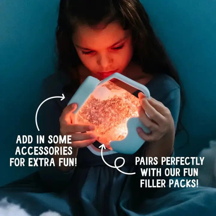 Meet the Sensory Play Jar – your kiddo's go-to-calm-down companion! The water-activated technology gently cycles through 9 soothing colors, creating a mesmerizing sensory experience. Kiddos can also tap to change colors. Pair it with your favorite Fun Fillers themes to customize your Sensory Pay Jar for any mood or moment (sold seperately). Its secure, spill-proof locking lid make it perfect for playtime at home or on the go.