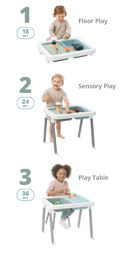 - 3 modes of sensory play: Floor Play (18m+), Table Play (24m+) & Play Table (36m+)