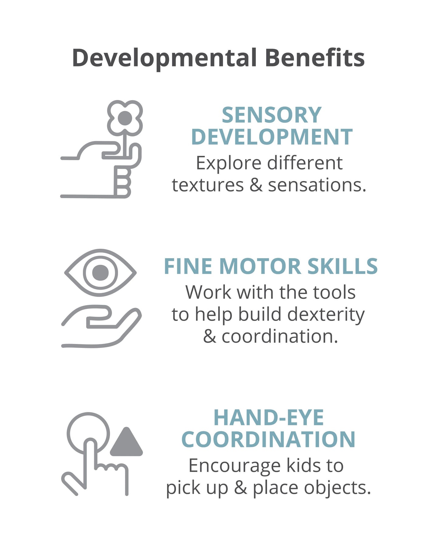 - Encourages sensory development, hand-eye coordination, cause & effect, motor skills & pretend play