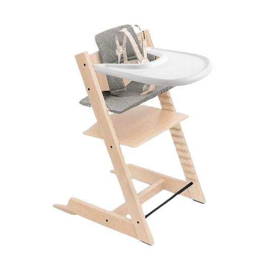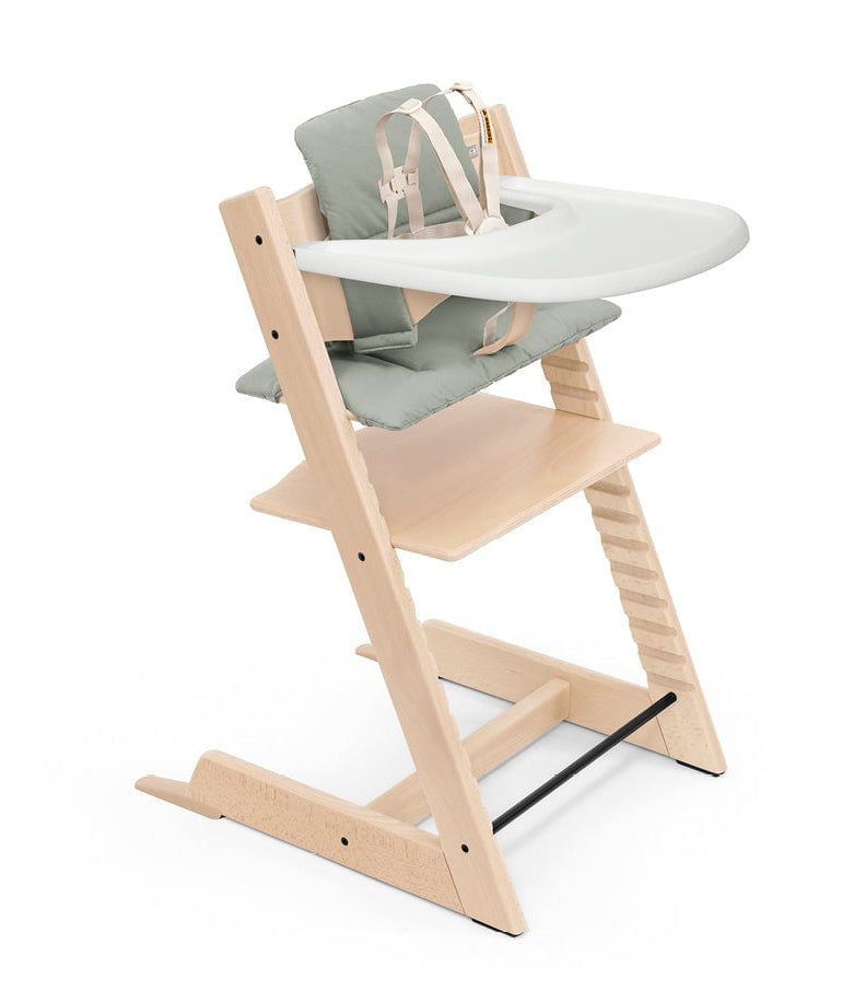 All wood and wood based parts are required to meet E.U. Timber Regulations and in so doing, support a responsible forestry and wood industry. Convenient all in one high chair plus accessories package that suits the needs of your child from 6 months to 3 years. Highly adjusted seat and footplate positions. Includes: Tripp Trapp® Chair, Extended Gliders, Cushion and Stokke® Tray.